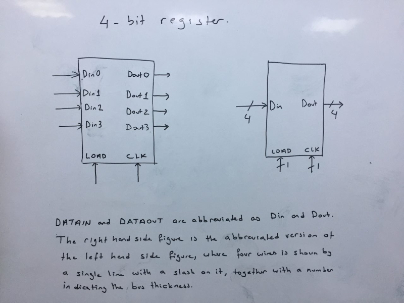 The simplest n-bit register has three input ports: DATAIN (n bits wide), CLOCK (1 bit wide), and LOAD (1 bit wide). It has a single output port: DATAOUT (n bits wide). The schematic for a 4-bit register is given below: