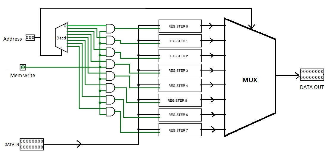 Memory acts like a huge register bank. The only difference with the register bank described above is that there is a multiplexer at its output.