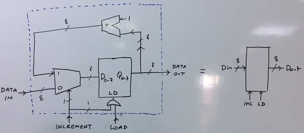 A more complicated type of register is “the register with increment”. In addition to the normal ports of a register (DATAIN, DATAOUT, LOAD, CLOCK) it has an additional 1-bit INCREMENT input. Its schematic is given below: