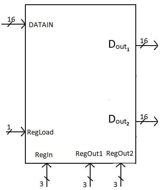 - If we want to write new data into register j, we put the data into the DATAIN port, we put the register number j into the REGSELECT port, and we make REGLOAD=1, and wait for the clock edge. After the clock edge, the data will be written into register j and that data will be displayed at port DATAOUT[ j ].