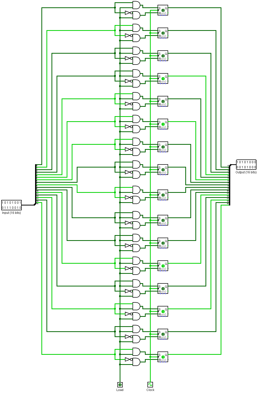 An n-bit register is formed by connecting n 1-bit registers in parallel. A 16-bit register drawn in Logisim is given below as an example.