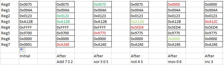 To see how these instructions work, consider the figure given below, where we have depicted the contents of the register bank after the execution of each instruction, one after the other. Source registers are shown in Green. Target register is shown in Red. If a register is both source and target, it is shown in red.