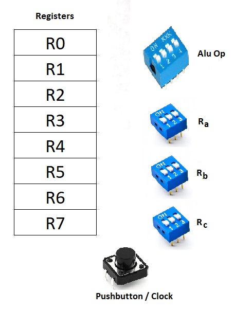 - one DIP-switch set, ALUOP, with 4-switches