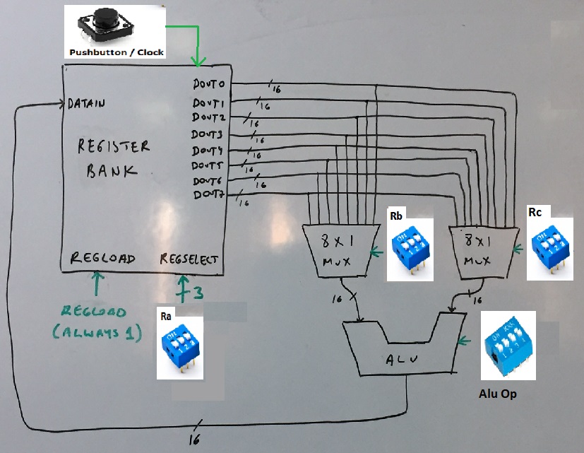 - After all the switches are set as described above, the human operator presses the pushbutton/clock and sends a clock edge to invertebrate. Invertebrate reads the source registers, executes the desired AL operation, and updates the register bank by writing the result back into the target register.