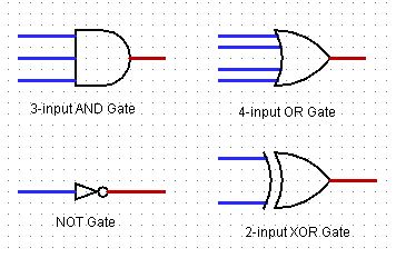 The basic combinatorial circuit elements are AND, OR and NOT Gates. Any combinatorial circuits can be constructed by using them. We will sometimes use XOR Gates in addition to this for practicality. The schematics of these circuit elements shown below.