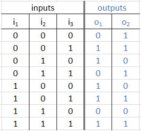 Example: If we have a combinatorial circuits with 3 inputs, i1,i2, i3, and 2 outputs o1,o2, the input-output relation of a combinatorial circuit can be represent by following truth table.