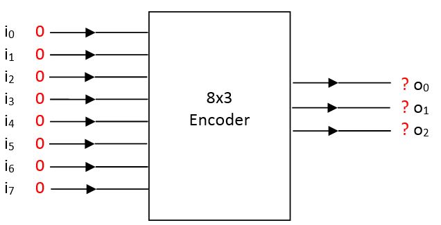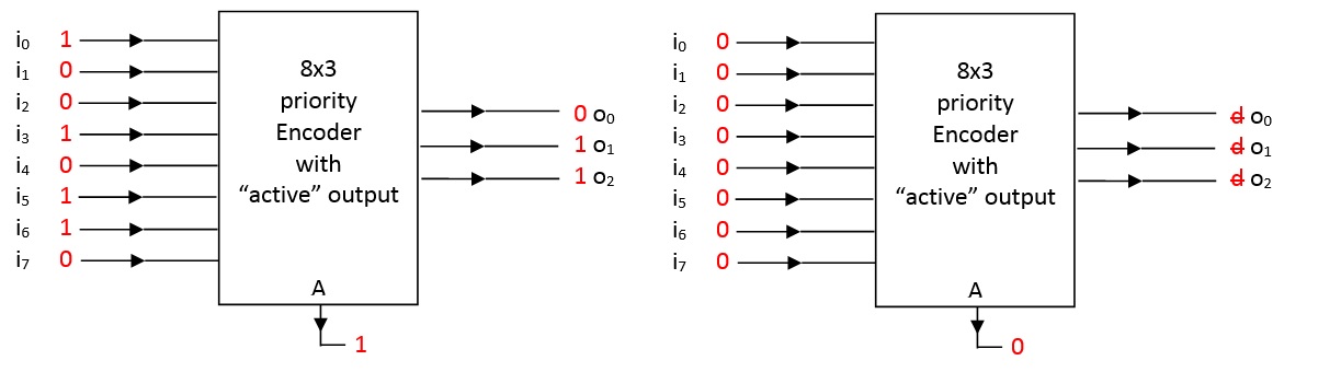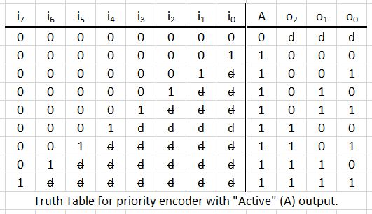 The problem of all-0 input is resolved by adding an “active” (A) output to the priority encoder. When all inputs are 0, the encoder is considered to be inactive and the active output becomes 0. In this case, the output of the encoder are undefined (or, “don’t care”, indicated by a letter d with a slash in the truth tables and diagrams). If any of the inputs is 1, the encoder is considered active and the “active” output becomes 1.