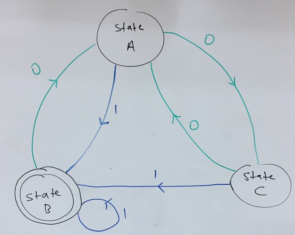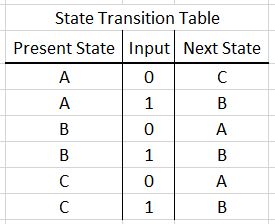 FSM always starts at the start state, which is indicated by a double circle. In our diagram the start state is the state B. The state transition table for the same FSM is