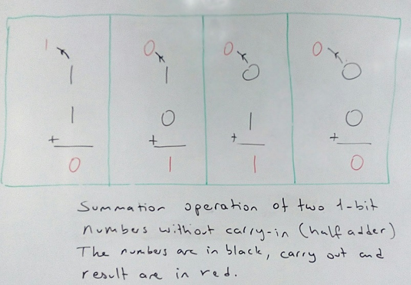 The circuit above is known as “half adder”. As mentioned above, it adds two 1-bit numbers. It has two inputs and two outputs..