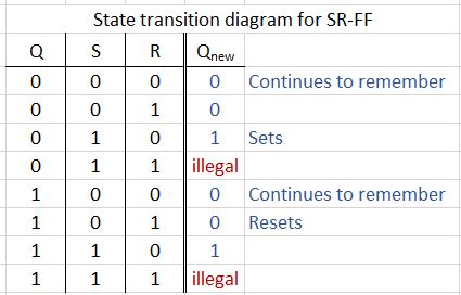 - If we keep the inputs as S=0, R=0, the SR-FF will continue to “remember” its state. ie, if its state is Q=0, it will continue to have Q=0 or if its state is Q=1, it will continue to have Q=1.
