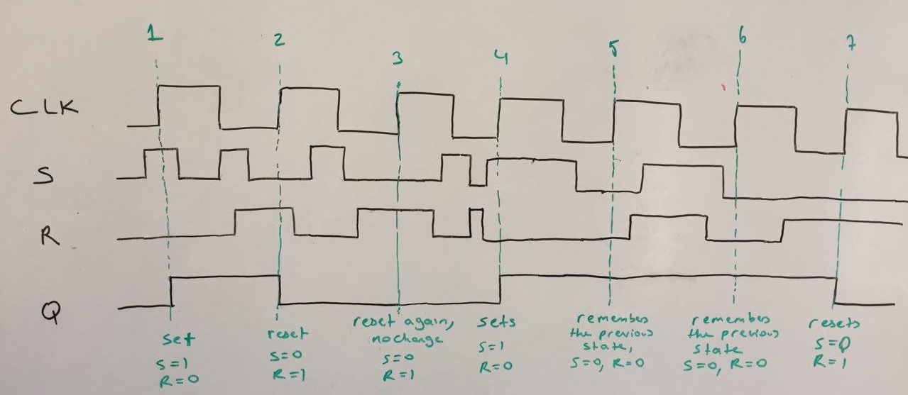 Note that the inputs (i,e S and R) are only important at the instant of positive clock edge. In all other times, FF completely disregards the inputs. Only at the positive clock edges, FF samples inputs and decides about the state (Q). In between the positive clock edges, the the input can change in any possible manner without affecting the state. It can even became illegal. For example, between clock edges 5 and 6, we have S=R=1, which is defined as “illegal”. This won’t affect FF behaviour as long as it doesn’t occur at positive clock edges.