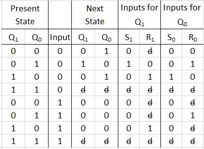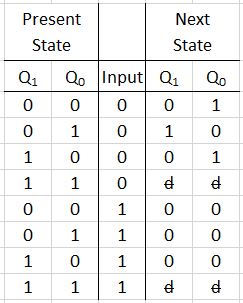 Note that we have assigned every bit of the state to a flip-flop (ie, Q1 and Q0). Hence we have two FF’s representing the states. Also, as we do not have a state 11, we mark its next state as don’t care (d with a bar).