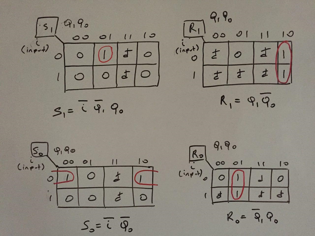 Next, we will add the inputs of the FF’s Q1 (S1 and R1) and Q0 (S0 and R0) to achieve the desired state transitions:
