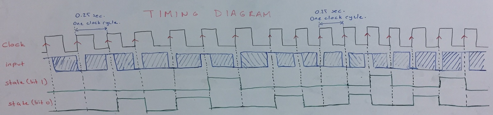 The timing diagram is given below. Note that the input is only needed to be defined at the positive edges. The FSM does not respond to the input when there is no positive edge. States also change only when there is a positive edge. They don’t change and remain steady out of positive edges.